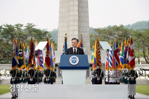 문재인 대통령이 6일 서울 동작구 국립서울현충원에서 열린 제66회 현충일 추념식에 참석, 추념사를 하고 있다./청와대사진기자단 |