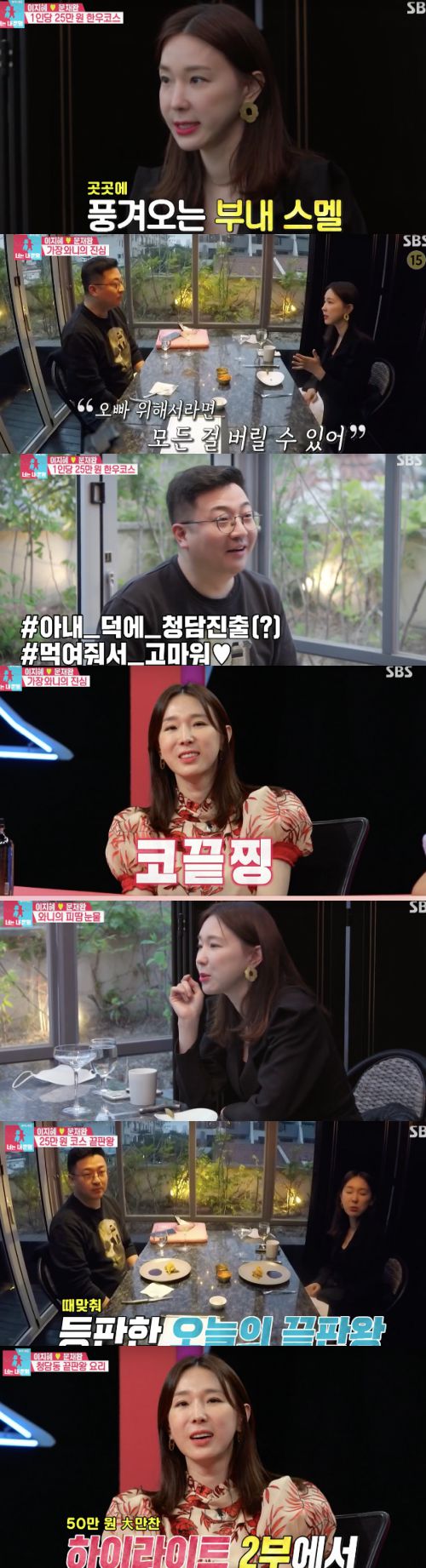 이지혜는 1인당 25만원하는 레스토랑을 예약하며 “평소엔 엄두도 못낼 금액”이라며 그만큼 특별 이벤트라 했다. 이어 두 사람은 도합 50만원인 만찬을 기대, 코스요리를 즐겼다.
