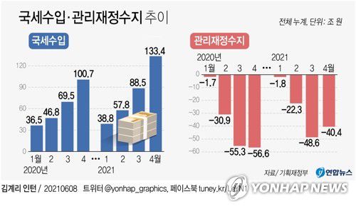(세종=연합뉴스) 박용주 이보배 곽민서 기자 = 자산시장의 열기가 이어지는 가운데 경기가 예상보다 빠른 속도로 회복되면서 올해 1∼4월에 거둬들인 세금이 1년 전보다 33조원 늘어났다.