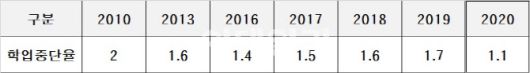 2010학년도~2020학년도 고등학교 학업중단비율 비교(자료: 종로학원) |