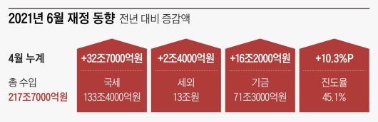 기획재정부가 8일 발표한 ’2021년 6월 재정 동향'에 따르면, 올해 1~4월 국세 수입은 133조4000억원으로 작년 같은 기간(100조7000억원)보다 32조7000억원 늘었다. 4월 한 달 동안에만 13조8000억원이 더 걷혔다. 기재부는 “경기 회복으로 법인세, 부가가치세가 더 걷혔고, 부동산‧주식 시장 호조로 양도소득세, 증권거래세 세수도 작년보다 늘었다”고 했다. 지난해 코로나 사태로 피해를 본 자영업자들에 대해 세금 납부를 유예해줘서 세금이 덜 걷혔던 기저 효과도 작용했다. 이 기저 효과가 8조8000억원쯤이라고 기재부는 추산했다. 또 고(故) 이건희 삼성 회장 유족들이 4월에 상속세 2조원을 납부한 것도 올해 세수 증가에 기여했다. 올해는 지난해보다 경기가 회복되고 있기 때문에 연간 추가 세수 규모는 앞으로 더 늘어날 것으로 기재부는 보고 있다. 홍남기 경제부총리 겸 기획재정부 장관은 적자 국채를 발행하지 않고 추가 세수로 2차 추경 재원을 마련하겠다고 지난 4일 밝혔다. 하지만 기재부 내부에서도 “세수가 늘어나면 국가재정법에 따라 지방교부세와 지방교육교부금을 정산하고 남는 돈은 국채를 상환하는 데 써야 하는데, 재정을 풀 생각부터 한다”는 말이 나오고 있다.