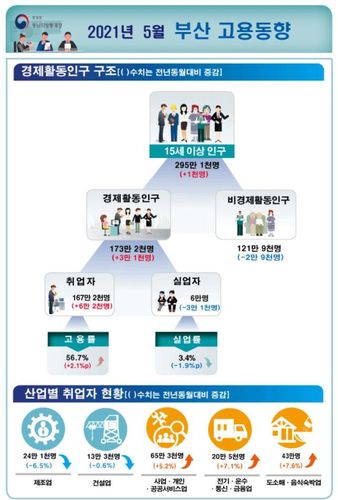 동남지방통계청이 9일 발표한 5월 부산시 고용동향을 보면 취업자는 167만2천명으로 지난해 같은 달 대비 6만2천명(3.8%) 증가했다.
