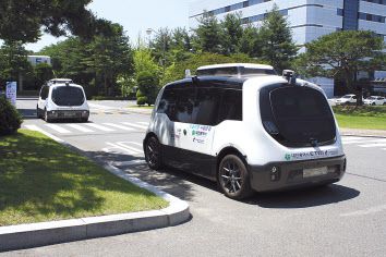 자율주행 셔틀버스 ‘오토비’가 연구원 내에서 경로를 따라 주행하고 있다. [ETRI 제공] |
