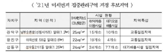 서울시는 지난해 금천·영등포·동작·은평·서초·중구 6곳을 미세먼지 집중관리구역으로 지정한데 이어 올해 자치구별 지역 특성에 맞는 미세먼지 집중관리구역을 확대 지정하기 위해 지난 3월 자치구 대상으로 수요조사와 전문가 현장평가를 실시, 관악·광진·성동구 3곳을 지정 후보지역으로 선정했다.