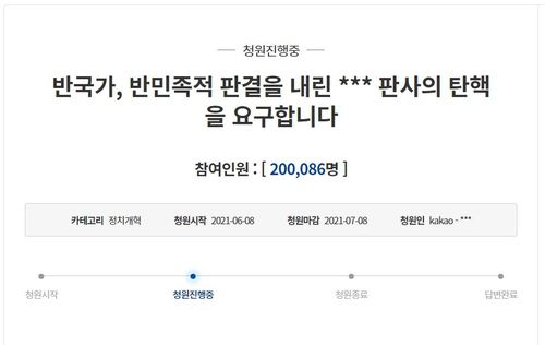 9일 법조계 등에 따르면 청와대 국민청원 게시판에는 서울중앙지법 민사합의34부 재판장인 김양호 부장판사를 탄핵해달라는 청원이 올라와 이날 오전까지 20만명 이상이 동의했다.