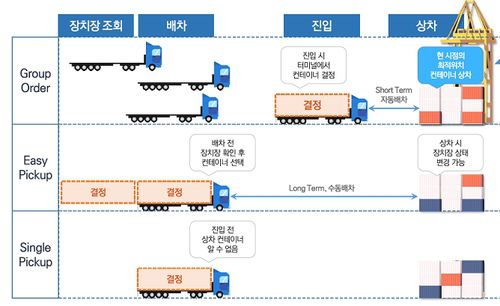 컨테이너 운송 주문을 개별적으로 하던 것을 환적 단위로 묶어서 해 다수의 차량이 가장 옮기기 편한 컨테이너부터 차례로 운송할 수 있도록 하는 것이다.