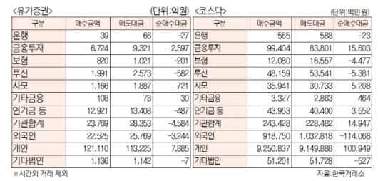 [표]유가증권 코스닥 투자주체별 매매동향(6월 9일)