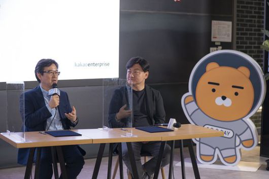 카카오엔터프라이즈는 9일 SAP코리아와 업무협약을 체결했다. 이성열 SAP 코리아 대표이사와 백상엽 카카오엔터프라이즈 대표이사(왼쪽부터)가 질문에 답변하고 있다. [사진 SAP코리아] |