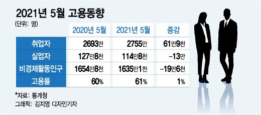 통계청이 9일 발표한 '2021년 5월 고용동향'에 따르면 지난달 취업자는 2755만명으로 전년동월대비 61만9000명 증가했다.