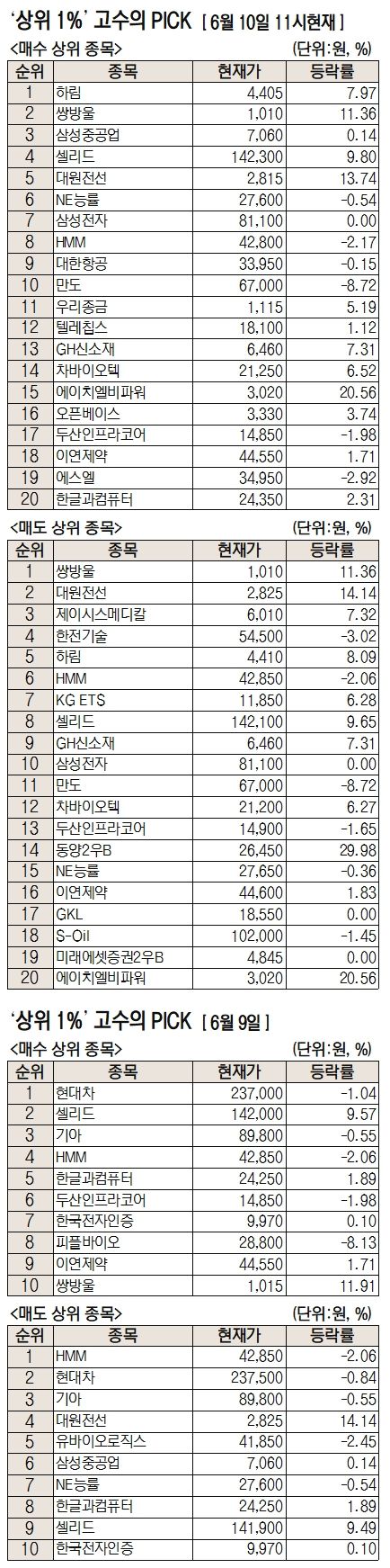 전일 ‘초고수’ 사이에서 매수는 현대차(005380)로 쏠렸다. 셀리드,기아(000270)가 그 뒤를 이었다. HMM(011200), 한글과컴퓨터(030520) 등도 매수 5위권 안에 이름을 올린 종목이다.