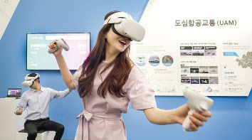 ‘2021 서울 스마트 모빌리티 엑스포(SSME 2021)’에서 가상현실(VR)로 구현된 도심항공교통(UAM) 콘텐츠를 통해 상암동에서 코엑스까지 이동하는 가상 체험을 하고 있다. [SK텔레콤 제공] |