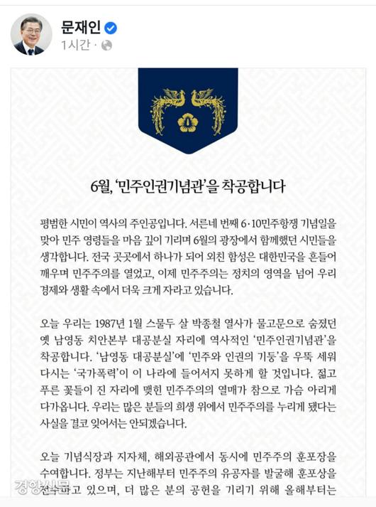 문 대통령은 6·10 민주항쟁 34주년을 맞은 이날 소셜네트워크서비스(SNS)를 통해 1987년 1월 박종철 열사가 물고문으로 숨졌던 옛 남영동 치안본부 대공분실 자리에 민주인권기념관이 들어선다고 소개하며 이같이 말했다.