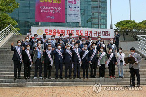 (포항=연합뉴스) 손대성 기자 = 경북 포항시의회는 10일 시의회 광장에서 규탄 대회를 열고 "일본 정부는 도쿄올림픽 지도에 독도를 자국 영토로 표기한 것을 즉각 삭제하고 사과해야 한다"고 촉구했다.