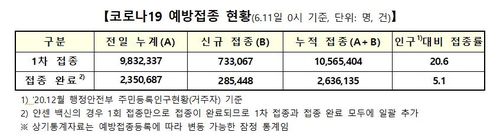 누적 1차 접종자는 1천56만5천404명(얀센 접종자는 1.2차 수치에 모두 반영)으로, 전체 인구(작년 12월 기준 5천134만9천116명)의 20.6%에 해당한다. 이 중 아스트라제네카 백신 접종자가 718만9천933명, 화이자 백신 접종자가 312만3천684명, 얀센 백신 접종자가 25만1천787명이다.
