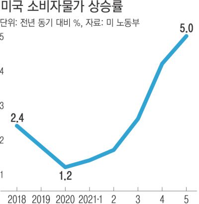 미국의 5월 소비자물가는 전년 동월보다 5.0%나 오르면서 2008년 8월 5.3% 이후 13년여 만에 가장 큰 폭으로 뛰었다. 전월 대비로는 0.6% 상승했다. 세부내용을 보면 중고차 가격이 전월보다 7.0%나 올라 가장 높이 뛰었고 이외에도 주거, 항공, 의류 등 광범위한 품목에서 가격 상승이 확인됐다.