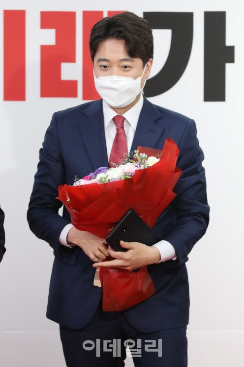 이준석 국민의힘 신임 당 대표가 11일 오전 서울 영등포구 여의도동 국민의힘 당사에서 열린 전당대회에서 꽃다발을 들고 있다.(사진=노진환 기자) |