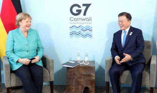 【김호연 기자·콘월(영국)=공동취재단】 주요 7개국(G7) 정상회의 참석차 영국을 방문 중인 문재인 대통령은 12일(현지시간) 오후 앙겔라 메르켈 독일 총리와 회담을 갖고 코로나19 대응과 한반도 정세 등에 대해 폭넓게 논의했다.