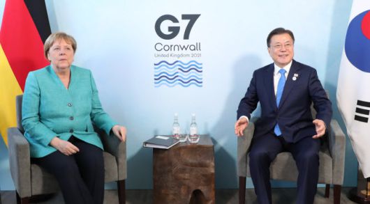 문 대통령은 이날 영국 콘월에서 메르켈 총리를 만나 한국이 금년 G7 정상회의에 초청국으로서 독일 등 G7 국가들과 함께 주요 국제 현안들에 대해 협의할 수 있는 기회를 갖게 된 점의 의미를 짚었다. 그러면서 한국은 G7 차원의 국제현안 해결 노력에 계속 기여하고자 한다고 했다.
