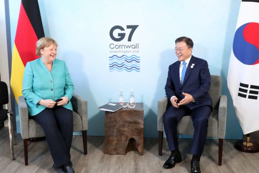 문 대통령과 메르켈 총리는 이날 오후 콘월 카비스베이 양자회담장에서 G7 정상회의에 앞서 양자회담을 진행했다. 문 대통령은 한국이 올해 G7 정상회의에 초청국으로서 독일 등 G7 국가들과 함께 주요 국제 현안들에 대해 협의할 수 있는 기회를 갖게 되어 의미 있게 생각한다고 말했다. 한국은 G7 차원의 국제현안 해결 노력에 계속 기여하고자 한다고 했다.
