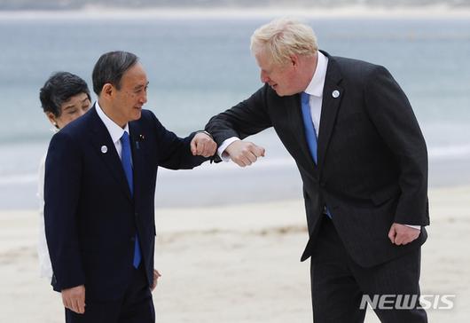 [콘월=AP/뉴시스]지난 11일(현지시간) 스가 요시히데 일본 총리(왼쪽)과 보리스 존슨 영국 총리가 콘월 카비스베이 해변에서 주요 7개국(G7) 정상회의 기념촬영에 임하기 전 팔꿈치 인사를 하고 있다. |