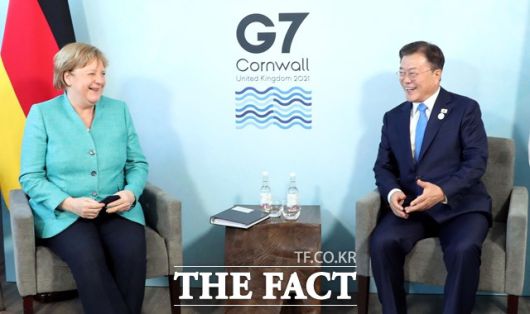 [더팩트ㅣ허주열 기자] 문재인 대통령이 영국 콘월에서 열리는 G7 정상회의에 참석 중인 가운데 12일(현지시간) 오후 앙겔라 메르켈 독일 총리와 만나 23분간 정상회담을 갖고 코로나19 대응, 기후변화, 한반도를 비롯한 동북아 정세 등에 대해 폭넓게 논의했다.