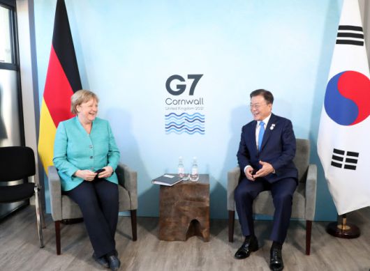 아울러 문 대통령은 “그간 G7 정상 중에서 메르켈 총리와 여러 계기에 가장 자주 소통하면서 긴밀히 협조해 왔다”며 “국제사회에서 메르켈 총리의 지도력과 기여에 다시금 존경과 감사를 표한다”고 말했다.