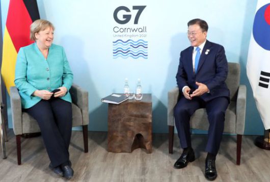【김호연 기자·콘월(영국)=공동취재단】 주요 7개국(G7) 정상회의 참석차 영국을 방문 중인 문재인 대통령은 12일(현지시간) 오후 앙겔라 메르켈 독일 총리와 회담을 갖고 코로나19 대응, 기후변화, 한반도를 비롯한 동북아 정세 등에 대해 폭넓게 논의했다.