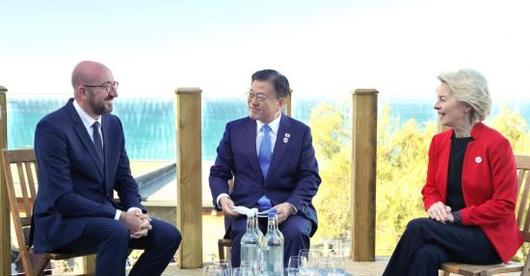 [아시아경제 류정민 기자] 문재인 대통령은 12일(현지시간) 영국 콘월에서 샤를 미셸 EU 정상회의 상임의장, 우르술라 폰 데이 라이엔 EU 집행위원장과 회담을 갖고 코로나 극복, 기후변화와 환경 협력, 양자간 교역 등에 의견을 교환했다.