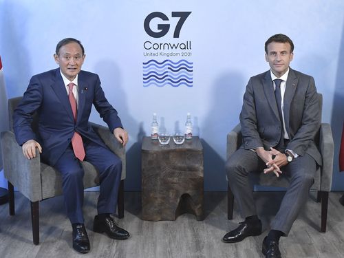 (도쿄=연합뉴스) 김호준 특파원 = 영국 콘월에서 열린 주요 7개국(G7) 정상회의에 참석 중인 스가 요시히데(菅義偉) 일본 총리와 에마뉘엘 마크롱 프랑스 대통령이 12일 오후(이하 현지시간) 양자 회담을 했다고 교도통신이 보도했다.