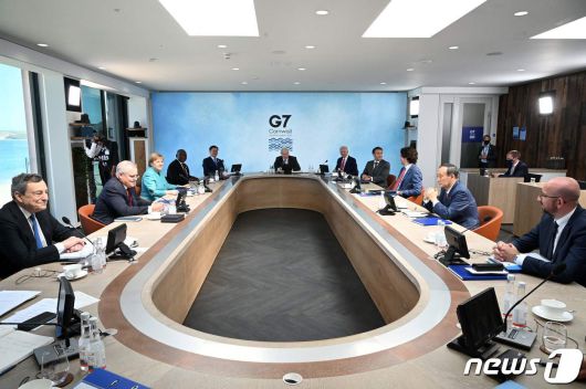 문재인 대통령이 12일(현지시간) 영국 콘월 카비스 베이에서 열린 G7 정상회의 실무회의에 조 바이든 미국 대통령, 보리스 존슨 영국 총리, 에마뉘엘 마크롱 프랑스 대통령, 앙겔라 메르켈 독일 총리, 스가 요시히데 일본 총리, 저스틴 트뤼도 캐나다 총리, 마리오 드라기 이탈리아 총리, 스콧 모리슨 호주 총리,시릴 라마포사 남아공 대통령, 샤를 미셸 EU 정상회의 상임의장과 참석을 하고 있다. © AFP=뉴스1 © News1 우동명 기자 |