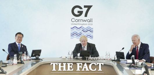 [더팩트ㅣ허주열 기자] 문재인 대통령이 12일(현지시간) 영국 콘월에서 개최된 G7 확대정상회의 첫 세션(보건)에 참석해 백신의 공평한 접근권을 강조하고, 한국의 글로벌 코로나19 대응 역할을 설명했다.