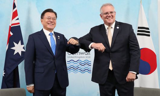 서방 주요7개국(G7) 정상회의 참석자 영국 콘월을 방문중인 문재인 대통령은 12일(현지시간), 스콧 모리슨 호주 총리와 대면회담을 가졌다. 문 대통령과 모리스 총리는 수소 생산 및 활용 등 저탄소 기술과 관련해 양국간 협력이 가능하다고 평가하고 민관 차원의 활발한 교류 및 핵심 광물 개발에서의 협력을 약속했다.