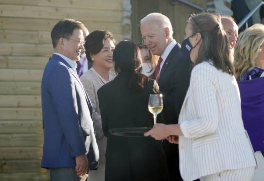 청와대에 따르면 문 대통령은 이날 G7 정상회의 회담장인 영국 콘월 카비스베이 호텔에서 조 바이든 미국 대통령과 스가 요시히데 일본 총리를 만났다. 바이든 대통령과는 지난달 한미 정상회담 후 20여일 만에, 스가 총리와는 처음 대면으로 마주했다.