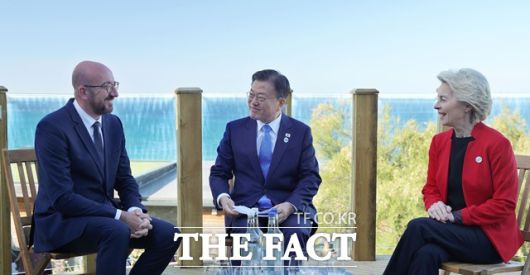 [더팩트ㅣ허주열 기자] 문재인 대통령이 G7 정상회의가 열리는 영국 콘월에서 12일 오후(현지시간) 샤를 미셸 EU(유럽연합) 정상회의 상임의장 및 우르술라 폰 데이 라이엔 EU 집행위원장과 회담을 갖고 코로나19 극복, 기후변화와 환경 협력, 양자 간 교역 등에 대해 폭넓은 의견을 교환했다.