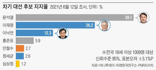 머니투데이·미래한국연구소가 여론조사업체 PNR리서치에 의뢰해 12일 하루 동안 전국 성인 1009명을 대상으로 조사한 결과, 윤석열 전 총장은 39.1%로 1위를 차지했다.