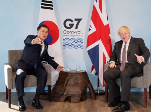 문 대통령은 이날 존슨 총리와 정상회의를 진행하고 “영국이 의장국인 올해 G7은 세계가 더 나은 재건으로 가는 확실한 이정표가 될 것이며, 그 과정에 한국에 함께 하게 되어 기쁘다”고 말했다고 박경미 청와대 대변인이 밝혔다.