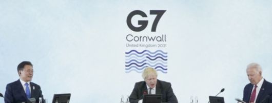 G7 정상회의 참석차 영국을 방문 중인 문재인 대통령이 12일(현지시간) 오후 영국 콘월 카비스베이에서 코로나19 백신 공급 확대 및 보건 역량 강화 방안을 다룬 확대회의 1세션에서 각국 정상들과 대화하고 있다. 왼쪽부터 문 대통령, 영국 보리스 존슨 총리, 미국 조 바이든 대통령.[연합] |