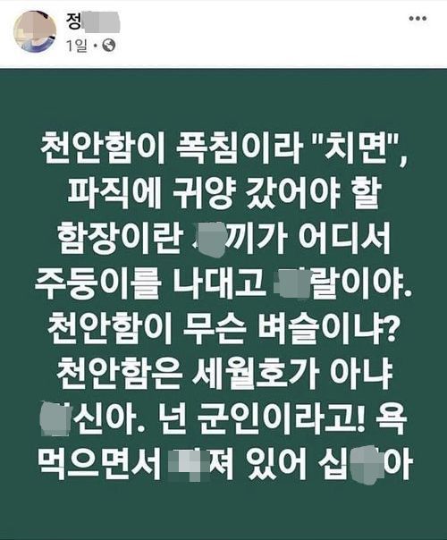 최원일 전 천안함 함장은 “천안함이 벼슬이냐”며 막말과 욕설을 자신의 페이스북에 올린 서울 휘문고 교사 정모씨를 경찰에 고소한다고 14일 밝혔다. 휘문고 1학년 담임 교사인 정씨는 지난 11일 자신의 페이스북에 “천안함이 폭침이라 ‘치면’, 파직에 귀양 갔어야 할 함장이란 새X가 어디서 주둥이를 나대고 지X이야”라며 “천안함이 무슨 벼슬이냐? 천안함은 세월호가 아냐 병X아. 넌 군인이라고! 욕 먹으면서 짜X 있어 십X아”라고 썼다. ‘조국백서’ 필진인 친문 논객 고일석씨도 지난 9일 최 전 함장을 향해 “별 시덥잖은 것까지 지X”이라며 “경계 잘못해서 생때같은 병사들 다 희생시킨 지휘관이 이렇게 고개 빳빳이 들고 다니며 막 삿대질하고 다니고 그래? 당장 군법회의로 보내야 할 놈을 진급까지 시켜서 무사 전역시켜 놓으니 이 따위로 기고만장”이라고 했다.