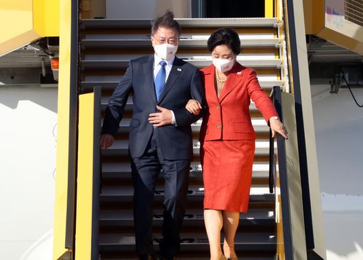 유럽 3국을 순방중인 문재인 대통령이 영국 콘월 G7 정상회의 참석에 이어 13일(현지시간) 오스트리아를 국빈방문했다. 문 대통령과 김정숙 여사가 비엔나국제공항에 도착한 뒤 공군 1호기에서 내리고 있다. [연합] |