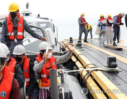 안개 등 기상 여건 탓에 예정 시각보다 1시간 늦게 선착장에 도착한 해군 한산도함 고속단정에 주민은 긴장된 모습으로 장병들의 안내를 받으며 올랐다.
