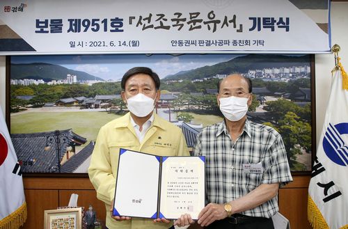 시는 이날 시청에서 기탁식을 열고 안동권씨 종친회로부터 선조국문유서를 기탁받았다.