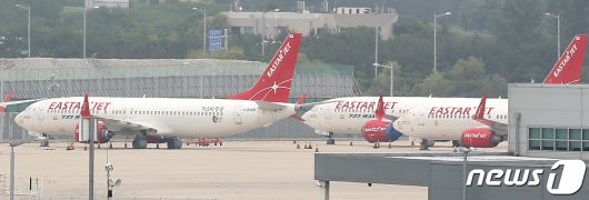 14일 인천국제공항 제1여객터미널 계류장에 이스타항공 여객기가 운행을 앞두고 대기하고 있다. 2021.6.14/뉴스1