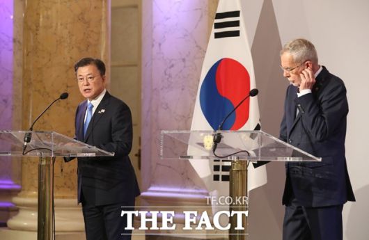 [더팩트ㅣ허주열 기자] 오스트리아를 국빈 방문 중인 문재인 대통령이 14일(이하 현지시각) "북한이 동의한다면 백신 공급 협력을 적극적으로 추진하겠다"고 밝혔다.