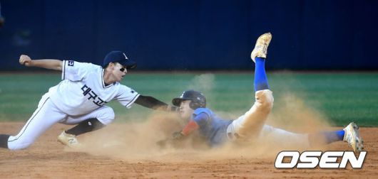 [OSEN=목동, 최규한 기자] 14일 오후 서울 목동야구장에서 ’75회 황금사자기 전국고교야구 대회’ 결승전 강릉고와 대구고의 경기가 열렸다. 4회말 무사 1루 상황 강릉고 김예준 타석 때 주자 김세민이 2루 도루에 성공하고 있다. 2021.06.14 / dreamer@osen.co.kr