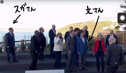 반면 문재인 대통령은 주최국 수장이자 의장인 보리스 존슨 영국 총리와 가까운 모습을 보이는가 하면 참가국 정상들에 둘러싸인 모습이 포착돼 일본 네티즌들 사이에서 이를 스가총리와 비교하는 설전이 이어지기도 했다.