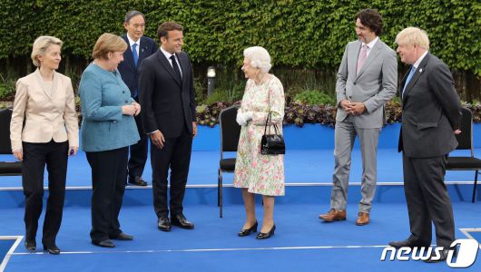 스가 요시히데 일본 총리(왼쪽 위)가 지난 11일부터 3일간 영국 콘월에서 열린 G7 정상회담에서 각국 정상들과 엘리자베스 여왕이 대화를 나누던 중 고립된 모습을 보이고 있다. © AFP=뉴스1 © News1 원태성 기자 |