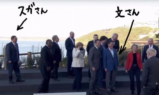 이에 일본어를 사용하는 트위터이용자 @grafico_kenzo는 문재인 대통령을 포함한 G7 정상회의 참가자들이 모여서 밝은 표정을 짓고 있는 가운데 스가 총리가 뒤쪽에 혼자 떨어져 있는 장면을 담은 사진에 스가 총리와 문 대통령을 화살표로 표시한 사진을 트위터에 올리고서 "커뮤니케이션 능력의 차이"라고 글을 썼다.