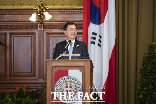 문재인 대통령이 15일(현지시간) 오스트리아 비엔나에서 큐어백사의 프란츠 베르너 하스 대표와 화상 면담을 갖고 한국과 큐어백의 코로나19 백신 협력 강화를 당부했다. 문 대통령이 지난 14일 비엔나시청을 방문한 모습. /뉴시스 |
