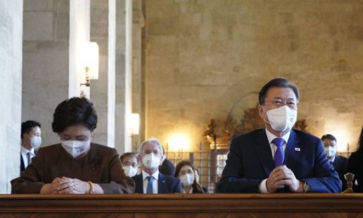 문 대통령은 "가톨릭은 고난과 고통의 시기에 인류에게 희망이 됐는데, 코로나로 어려운 시기에 전 인류가 연대와 사랑으로 서로 도와 슬기롭게 극복할 수 있도록 기도해달라"고 당부했다.