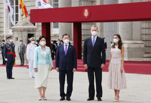 문 대통령은 이날 오후 5시부터 약 30분 간 스페인 마드리드 왕궁에서 열린 펠리페 6세 국왕 주최 공식 환영식에 참석했다. 이번 국빈 방문은 2년 전 펠리페 6세 국왕의 국빈 방한에 대한 답방 성격이며 코로나19 이후 스페인의 첫 국빈 방문이다.